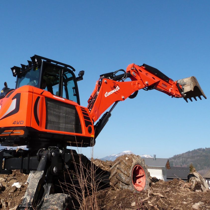 In 1993 the first 5t class Menzi / Euromach 4000 model was introduced, – the first to have servo-controls on the arm-rests for the main functions, but still with separate levers for the chassis functions! Following the closure of the UK dealer, and shortly afterwards the original Menzi company; Euromach srl were approached directly for spares and support. An agreement was reached to sell the machines and the relationship that started then continues to this day.